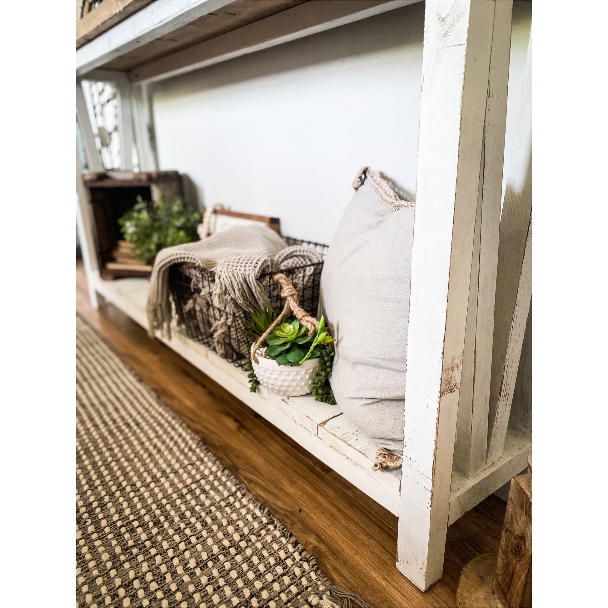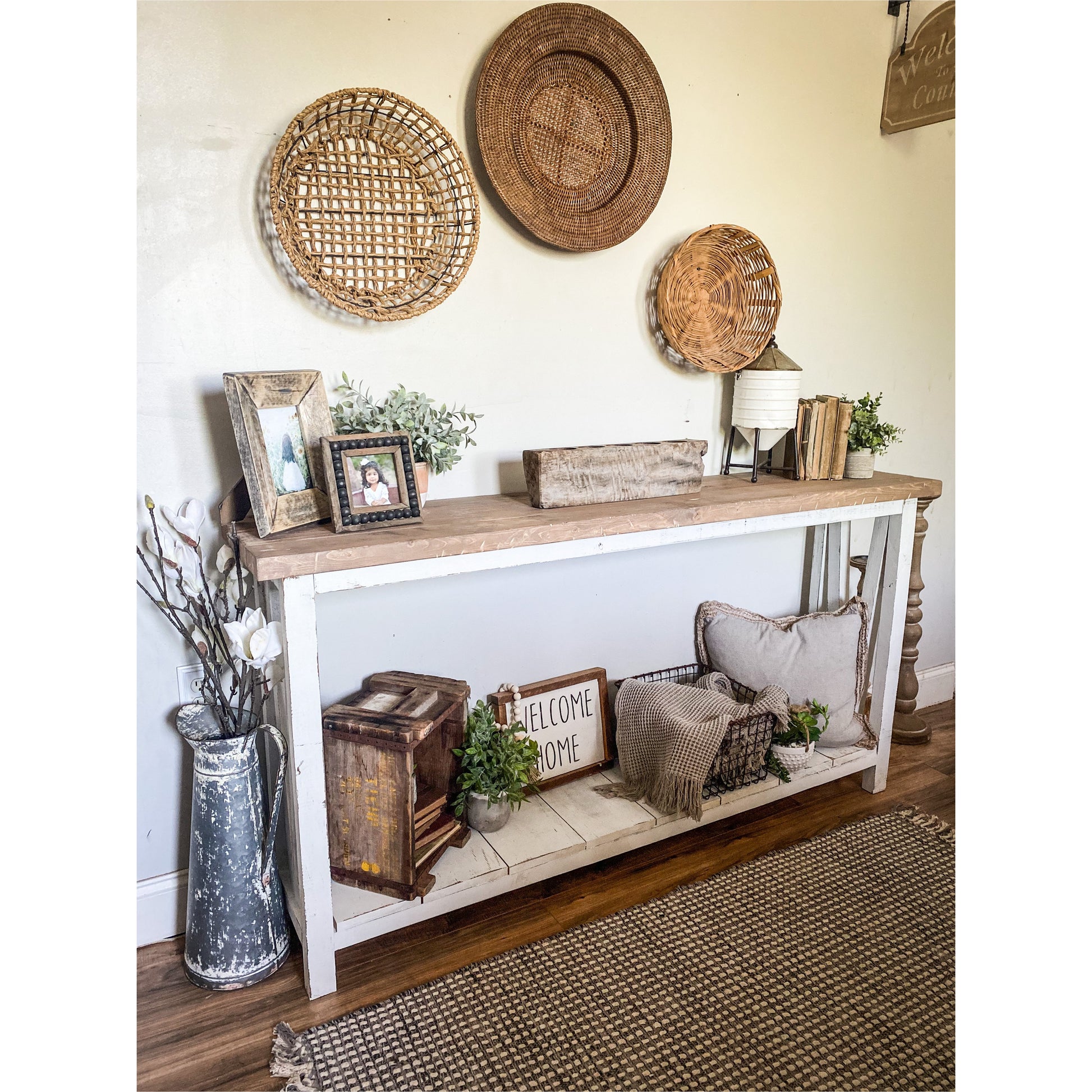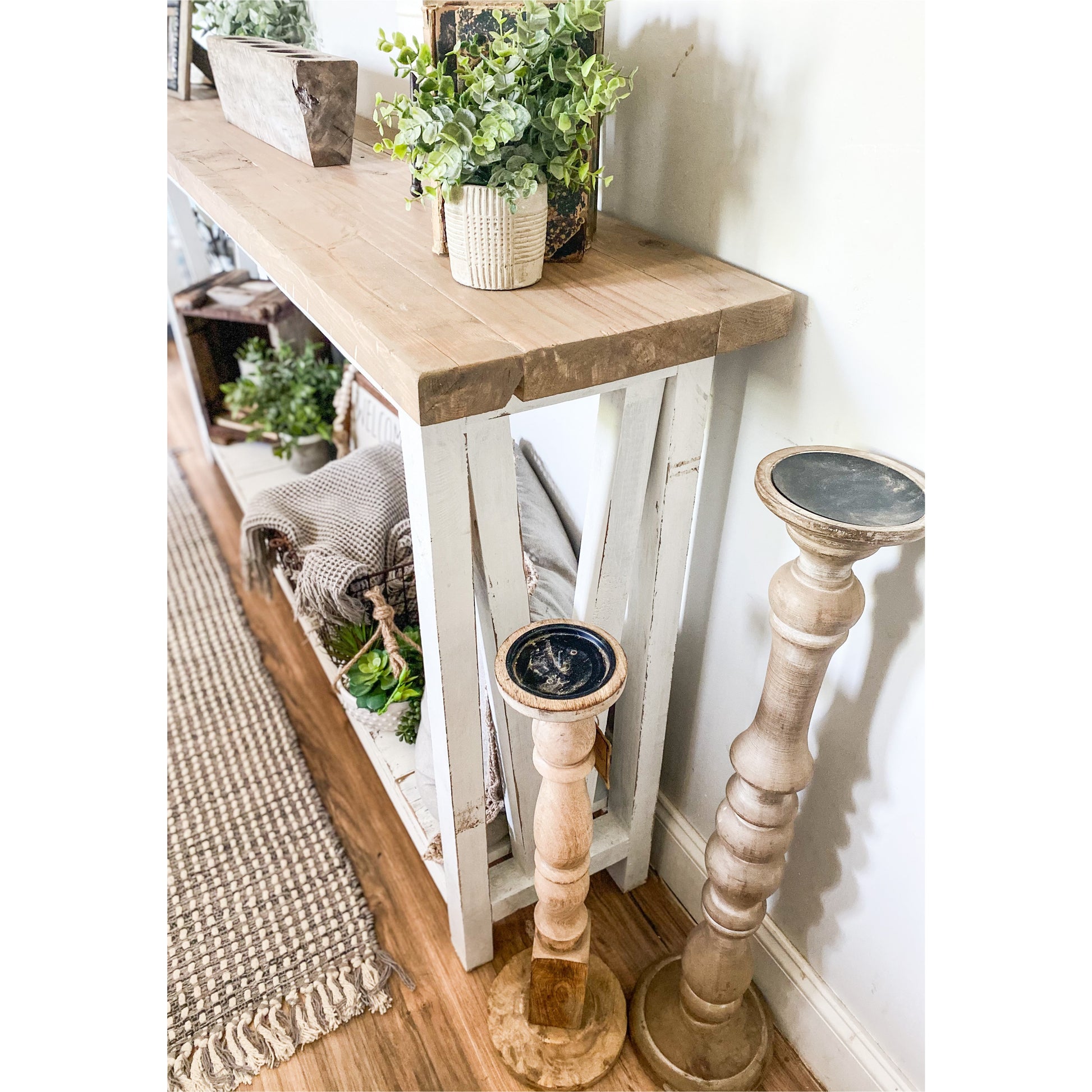 This gorgeous farmhouse entry table makes the perfect table for any entryway, side table, hall table, and the list goes on!! From the distressed look, to the dinged up top truly gives this table a one of a kind look!