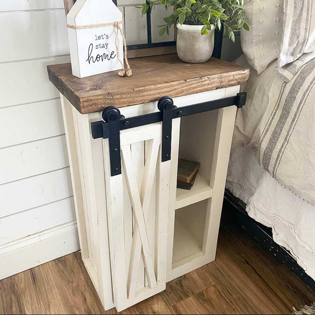 How adorable is this farmhouse nightstand?!?! Perfect, for adding a little touch of modern farmhouse decor to your home. I can't tell you enough how this design went over and over in my head until I finally executed the design myself!! Our Bella nightstand is the perfect nightstand for any room in your house. Made from solid wood, and steel our nightstand is sure to last a lifetime. The door slides smoothly from one side to the other and has more than enough storage space below to stage a couple of baskets, old books, or pretty much any cute knit knacks you can find. It is super sturdy and full of charm. The shiplap lines edged on the sides and door help to truly bring home the farmhouse feel everyone is in love with these days!